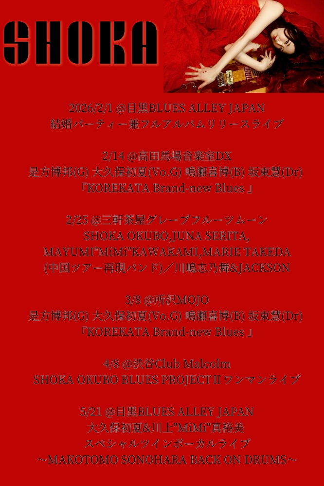 SHOKA OKUBO BLUES PROJECT初代ドラマーの其原誠元が、今年からドラマーとしての活動を本格的に再始動していくので、その皮切りライブとして、MiMiとSHOKAのツインボーカルの激アツなBACK ON DRUMSライブ開催決定!!!